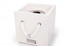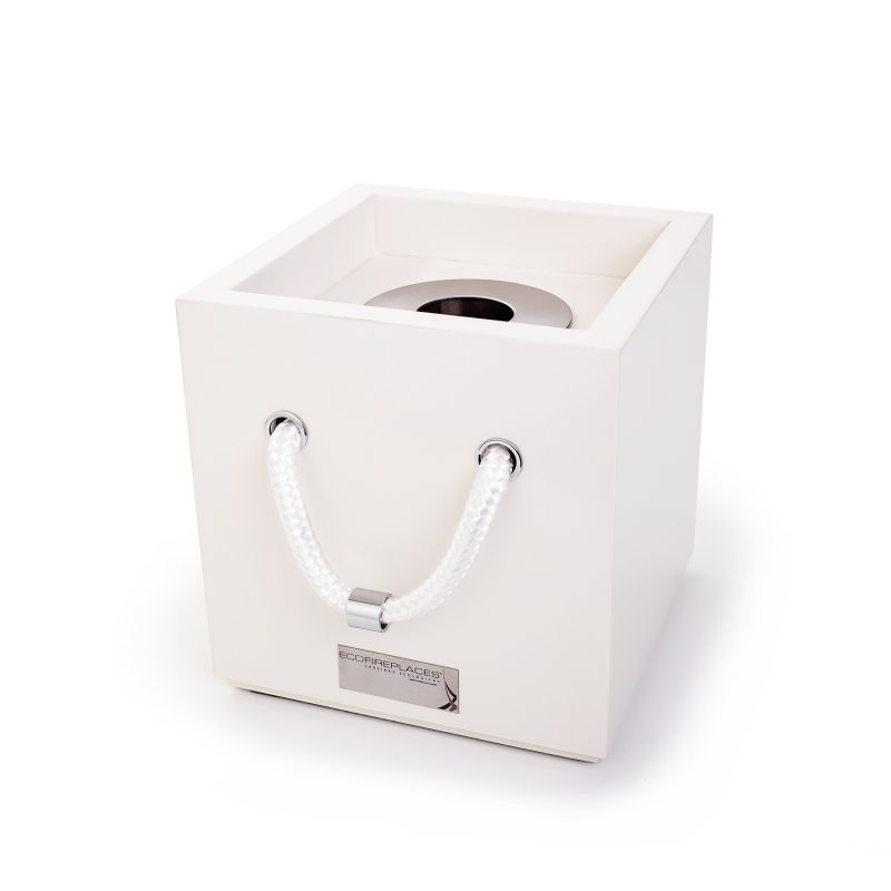 Lareira Ecológica Portátil Ecofireplaces, com base em Porcelanato Branco. Queimador com capacidade para 800 ml de Biofluido. Aquece uma área aproximada de 10 m² e pesa 10 kg. Com dimensões de 25 x 25 x 25 cm.