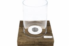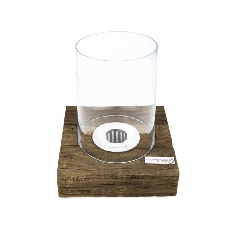 Lareira Ecológica Portátil Ecofireplaces, com base de madeira rústica de demolição. Aquece uma área aproximada de 10 m² e pesa 10kg. Com dimensões de 30 x 30 x 38 cm.