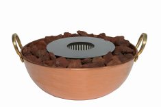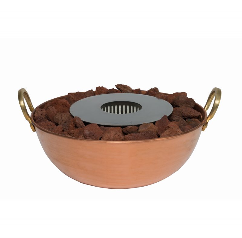 Lareira Ecológica Portátil Ecofireplaces em Tacho de Cobre, manta térmica, argila expandida e acabamento em Pedras Vulcânicas. Com Queimador ECO 35 com capacidade para 5 litros de Biofluido. Dimensões Ø 60 x 18 cm. Aquece uma área aproximada de 50m² e pesa 20kg.