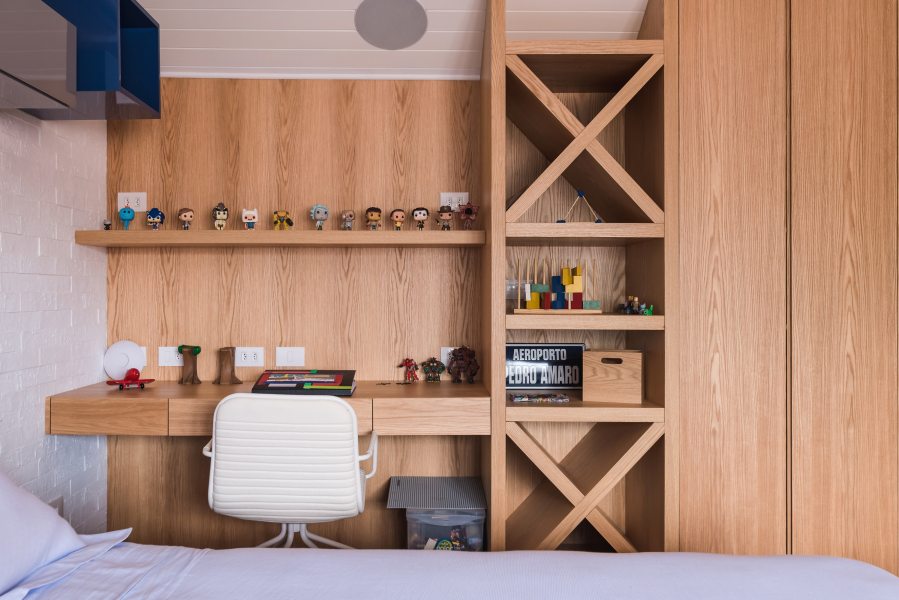 Nesse projeto, o Estúdio Cipó projetou uma estante toda aberta em madeira carvalho americana, com divisórias estratégicas que guardam tanto os itens de decoração quanto os livros do jovem cliente. Mais uma vez a atemporalidade foi o destaque da decoração. A madeira ajudou no ar acolhedor do local e fez um bonito contraste com os demais elementos do quarto!