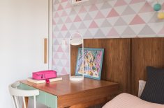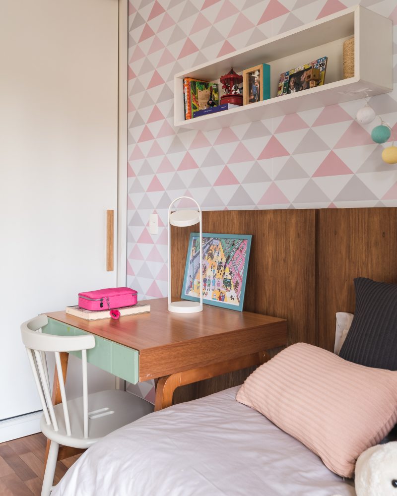 No quarto de criança é importante reservar um local para estudos. O painel de madeira em Freijó complementa a escrivaninha e a cama, delimitando o pequeno espaço. Desse modo, o quarto flerta com o atemporal utilizando cores neutras e papel de parede geométrico.