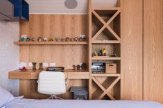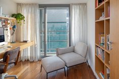 Nesse projeto do Estúdio Cipó com o arquiteto Danilo Hideki, a mesa foi reaproveitada do jovem casal de moradores. Além disso, os armários são móveis flexíveis, caso eles queiram transformar o ambiente em um quarto de bebê no futuro. Para controlar a rica iluminação natural, um tecido delicado foi escolhido para as cortinas. Pensando na organização, a estante de nichos, também em madeira de cor clara, foi projetada para receber livros e documentos.