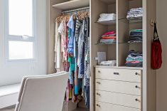 Um escritório dentro do closet é muito prático. A mesa, feita em laca brilhante branca, foi posicionada estrategicamente ao lado do armário em MDF formicado, e em frente à janela, para aproveitar a iluminação natural. As profissionais se preocupação com a circulação do ambiente e consideraram um espaço de 78cm entre as peças. “Assim, quando não estiver trabalhando, a moradora pode utilizar o móvel como uma penteadeira”, conta Elisa.
