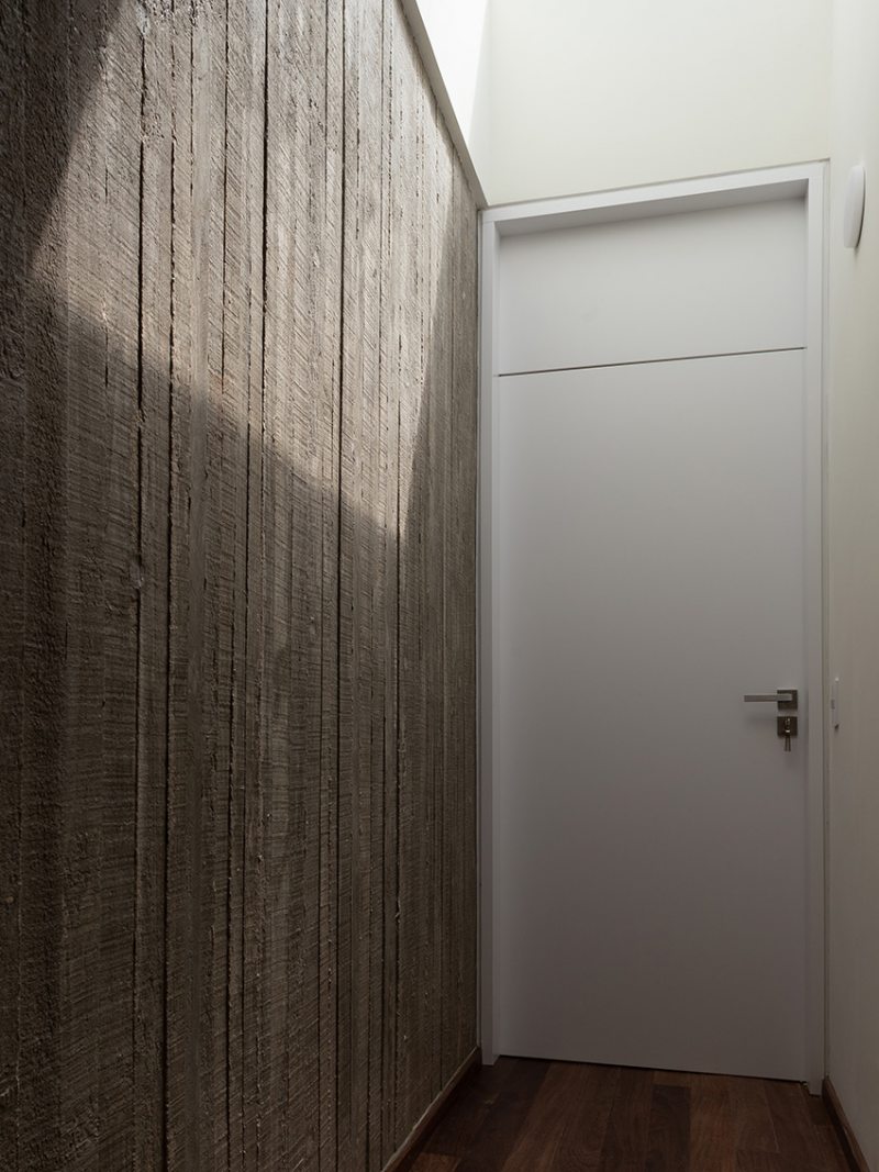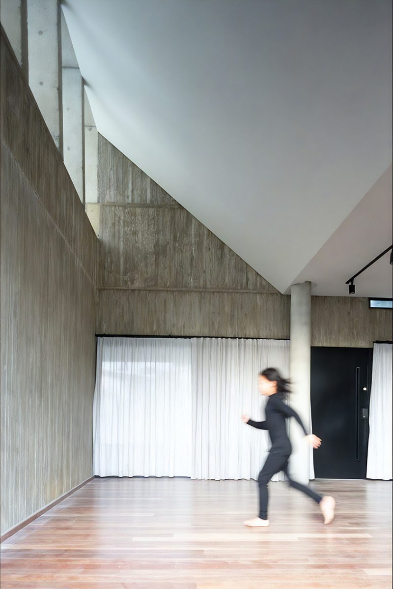 Na Casa Angélica, em um lote urbano em Curitiba, a arquitetura opera através de dualidades. A volumetria frontal é definida por uma membrana externa de concreto cru em que a textura ripada aparenta uma armadura invulnerável voltada para a rua. Esta dureza externa, no entanto, é o que garante a preservação de um interior etéreo e fluido.