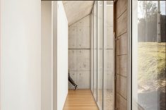 A circulação longitudinal, concebida como uma galeria envidraçada, organiza a fachada frontal. O percurso interno é marcado pela escada sob cobertura zenital e pérgolas de concreto, e atua como um elemento articulador entre os pavimentos. Ao descer, a visão da mata é gradualmente revelada até culminar em um vão panorâmico que se estende por toda área social, com pé-direito alto e vigas invertidas para maximizar a amplitude espacial através da laje em concreto aparente, plana e contínua. As empenas laterais em concreto aparente não apenas garantem a privacidade em relação aos vizinhos, mas delimitam o gesto horizontal que orienta toda a implantação.