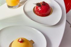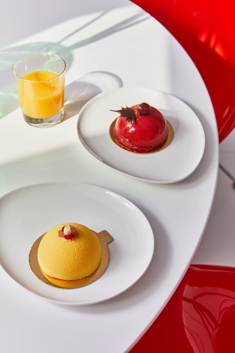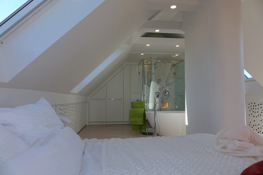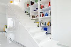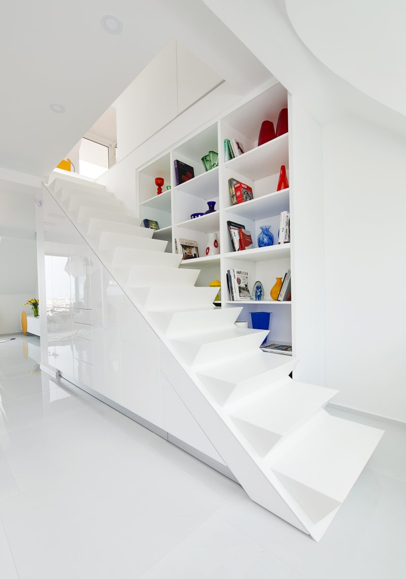Tanto o balcão da cozinha quanto os degraus da escada foram trabalhados em Corian, um material de alta resistência e durabilidade que permite ser moldado para a criação de móveis curvilíneos e paredes com cantos arrendondados, sem deixar emendas aparentes. A suíte do primeiro andar possui uma cama feita sob medida, para dar a impressão de flutuar. No andar de cima, mais um quarto com banheiro, que traz um espaço para o box e outro para a banheira escultural. O apartamento conta ainda com dois terraços com vista panorâmica para a cidade, ideal para receber os amigos em casa ou para saborear um café da manhã a dois.
