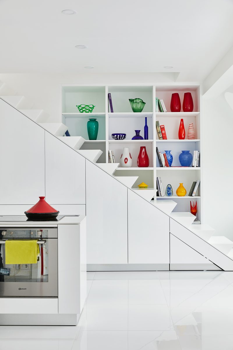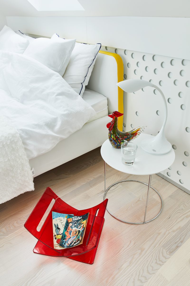 A cor branca predomina no piso, nas paredes e em quase todos os móveis do espaço. Cores primárias, com amarelo, azul e vermelho, foram utilizadas em objetos decorativos, móveis soltos, tecidos e detalhes para quebrar a monocromia.