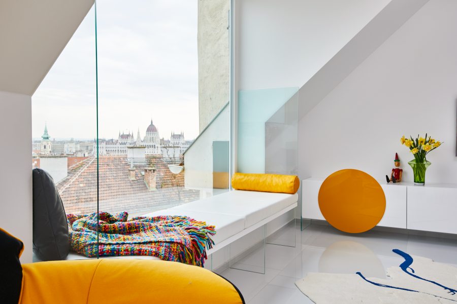 No living, a ampla janela com vista para o Palácio Real é ladeada por um banco com pés de vidro e duas cadeiras amarelas de design italiano dos anos 80. No chão, o tapete de lã feito sob medida imita o mapa da cidade, com uma linha azul simbolizando o Danúbio e um ponto vermelho indicando o endereço do apartamento. A cozinha integrada com a pequena sala de jantar utiliza o vão embaixo da escada como espaço de armazenamento de eletrodomésticos – máquina de lavar roupas, micro ondas e adega – de baixo consumo de energia.