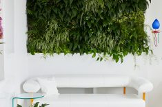 O jardim vertical com irrigação automatizada e a vegetação pontual espalhada pelo apartamento imprime tons de verde que finalizam a atmosfera fresh e super contemporânea do projeto.