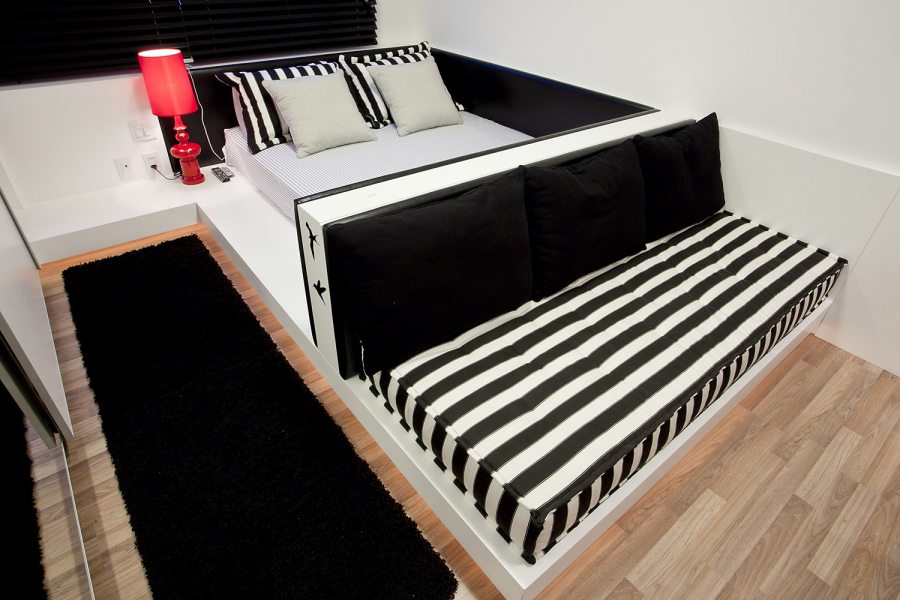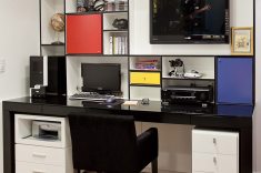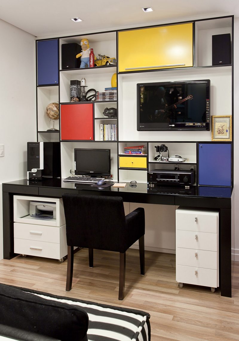 Além de cama com sofá, o quarto ganha espaço para estudo inspirado em uma obra do pintor Piet Mondrian, que dá o toque de personalidade para o quarto do filho da proprietária.