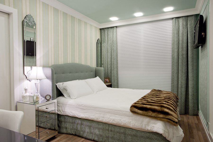 O quarto extra, para hóspedes, recebe tom clássico sem fugir de alguns toques modernos, como por exemplo a cabeceira estofada e o criado mudo espelhado.