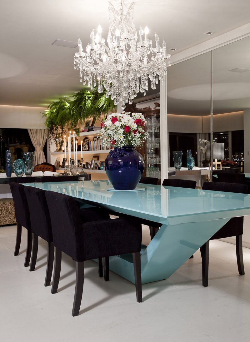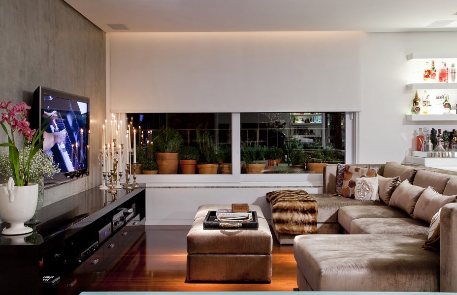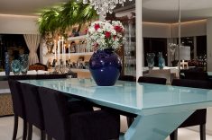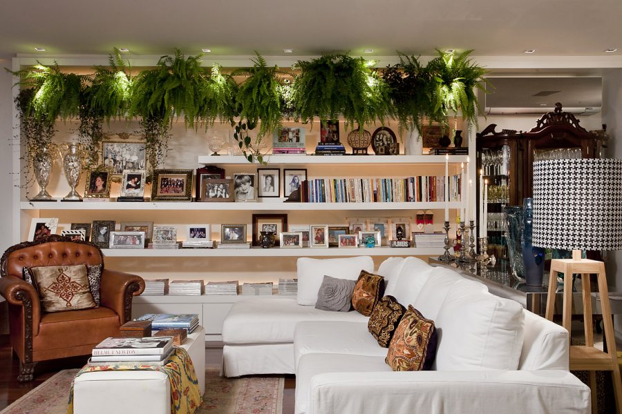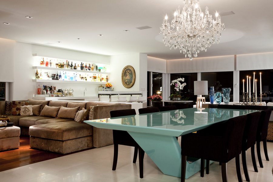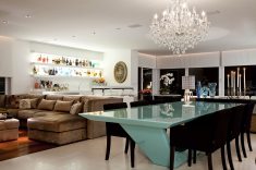 Na sala de estar, a protagonista é uma estante branca que, além de ser iluminada em cada nicho, conta com plantas na parte de cima que foram dispostas de forma totalmente inusitada. Na sala de TV, o móvel em laca preta contrapõe-se à parede de cimento queimado, com castiçais do acervo pessoal da proprietária. A sala de jantar dispõe de uma mesa azul e cadeiras roxas, transmitindo referências fashion para a casa.