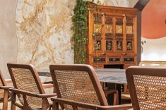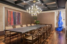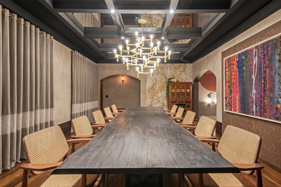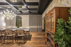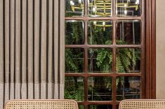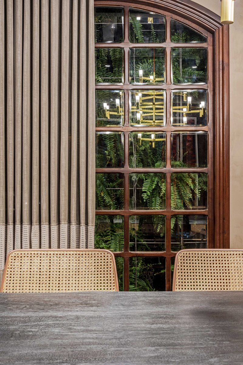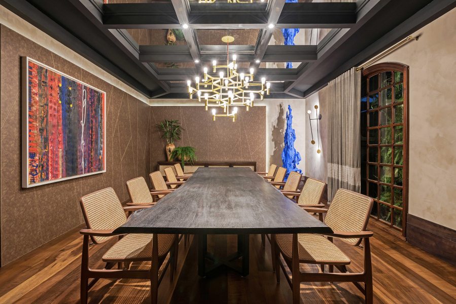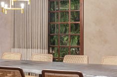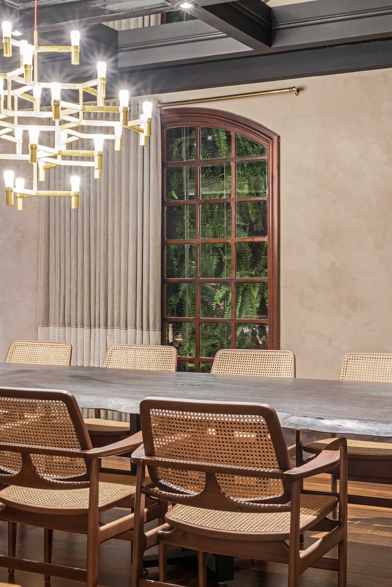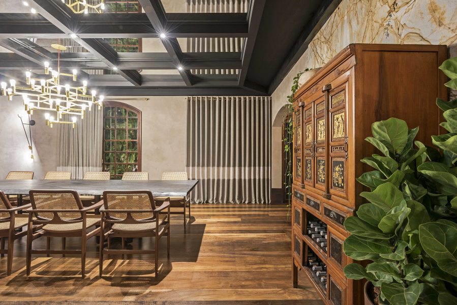 Na Sala de Jantar, de Janaina Macedo, o próprio espaço original serviu de inspiração: “Fazia tempo que a Casa Cor não acontecia em uma casa de verdade e isso engrandeceu o meu projeto. Tive a oportunidade de conhecer o proprietário do imóvel, que me contou os detalhes da construção, e sua enorme paixão me envolveu. Procurei manter as características originais da edificação, como o piso de madeira e o forro espelhado, valorizando também os janelões em cerejeira com cristais bisotados”, comenta Janaina.