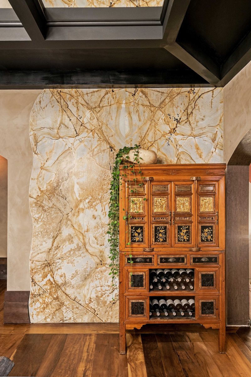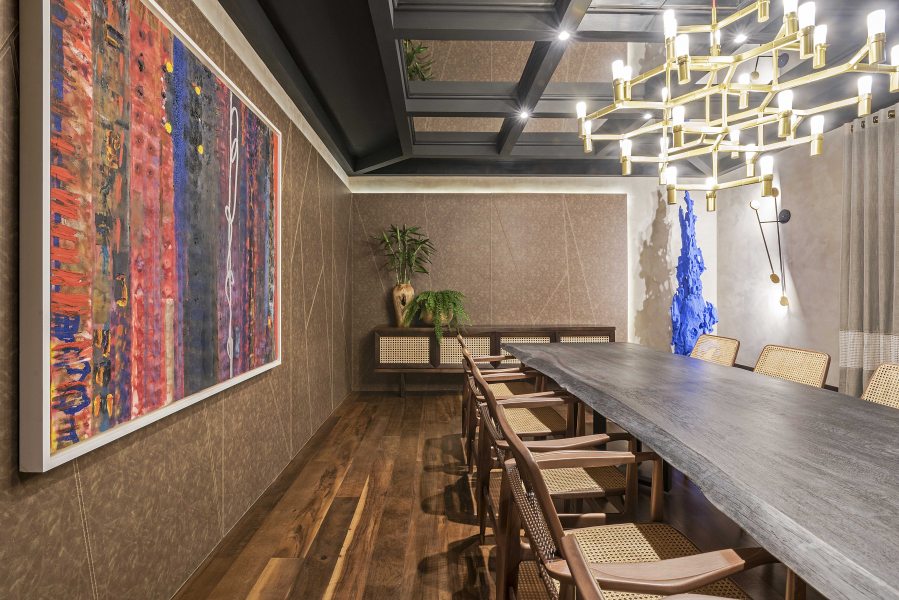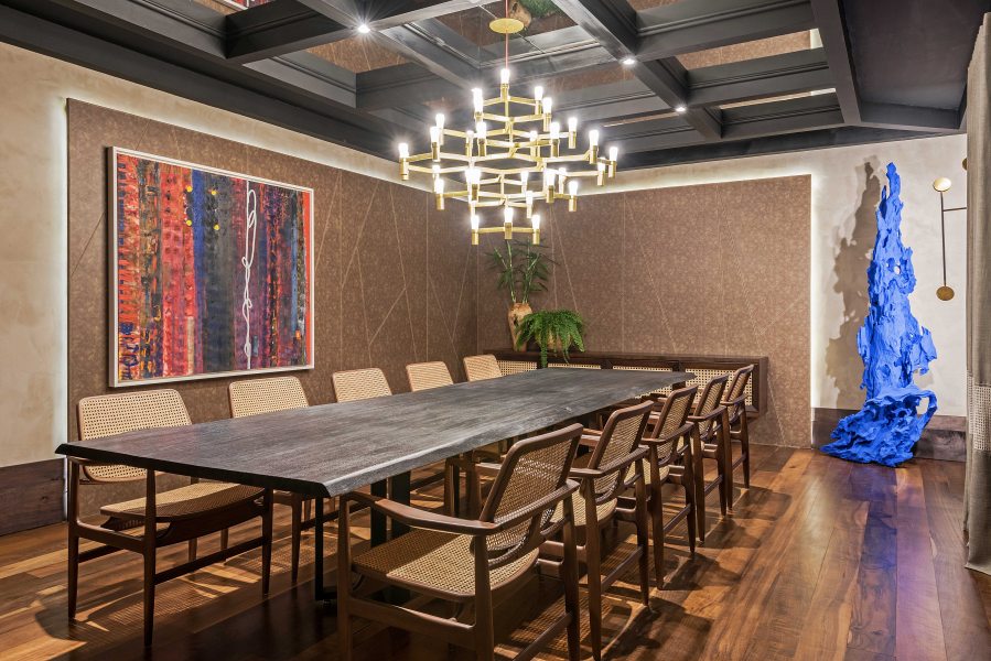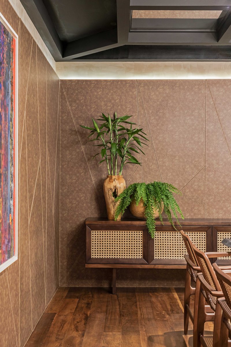 Em uma das paredes (atrás da cristaleira) uma peça de granito Roma Imperiale, da @gramarcalmarmores. Para finalizar, tela do artista plástico Siron Franco e escultura em madeira natural resgatada do fundo de um rio, de Eleutherio Netto, pigmentada com Lápis-Lazúli.