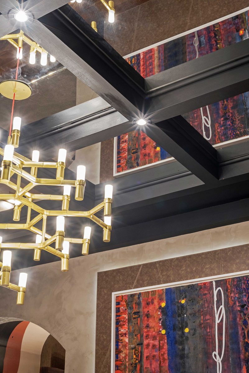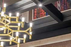 O maxi lustre é uma releitura do clássico candelabro, com 1,15 metros de diâmetro, em metal dourado da Grey House Iluminação.