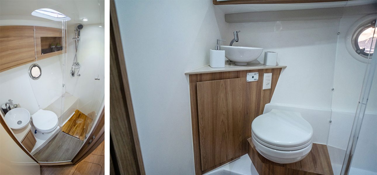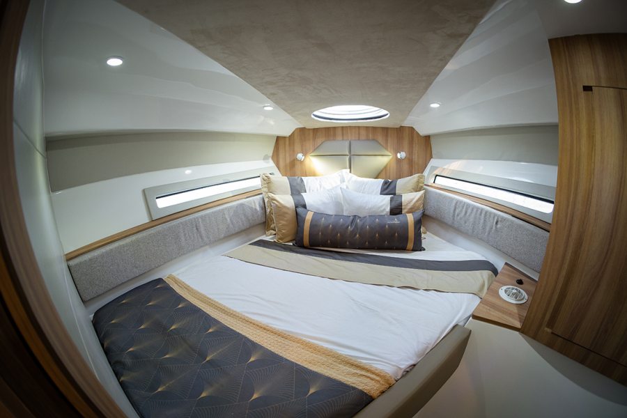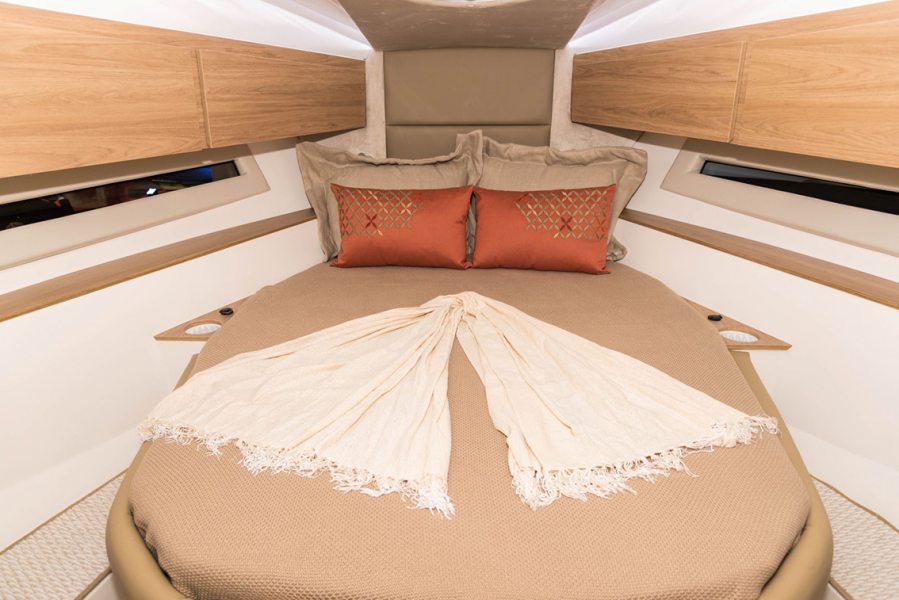 O mar exige escolhas precisas. Estofamentos náuticos que resistem ao sol e ao sal, carpetes anti-mofo, vidros amplos capazes de iluminar mesmo as áreas mais compactas e marcenaria sob medida formam a base de interiores que precisam durar muitos anos.