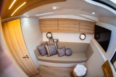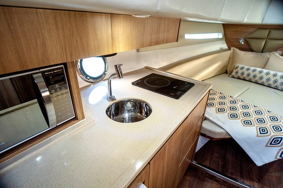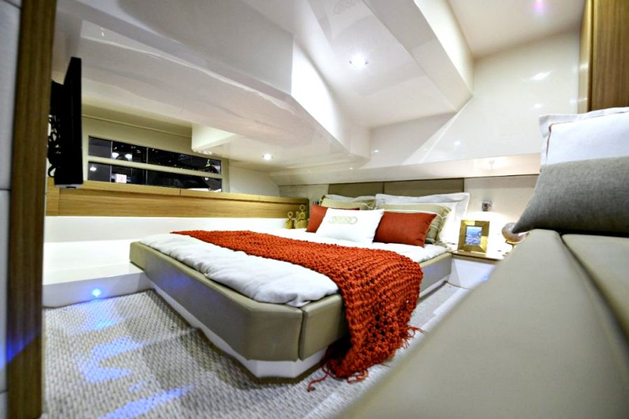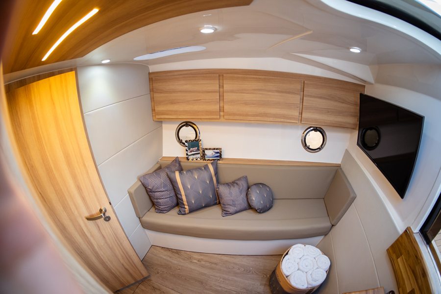 Em boa parte das embarcações de lazer entre 30 e 40 pés — faixa bastante comum no mercado brasileiro — o espaço útil interno costuma ficar na casa dos 15 a 25 m², dependendo do layout e da configuração escolhida. É uma metragem equivalente a um estúdio compacto, mas que precisa acomodar áreas sociais, cabines, cozinha, banheiro e circulação. Esse dado dá a medida da tarefa: fazer com que um interior reduzido funcione como uma pequena casa em movimento, sem sensação de aperto.