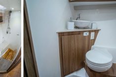 O design precisa ser compacto, mas confortável. O espaço social — onde a família passa a maior parte do tempo — combina layout acolhedor com soluções técnicas, como cantos arredondados, superfícies fáceis de limpar e peças multifuncionais que se transformam conforme a navegação.