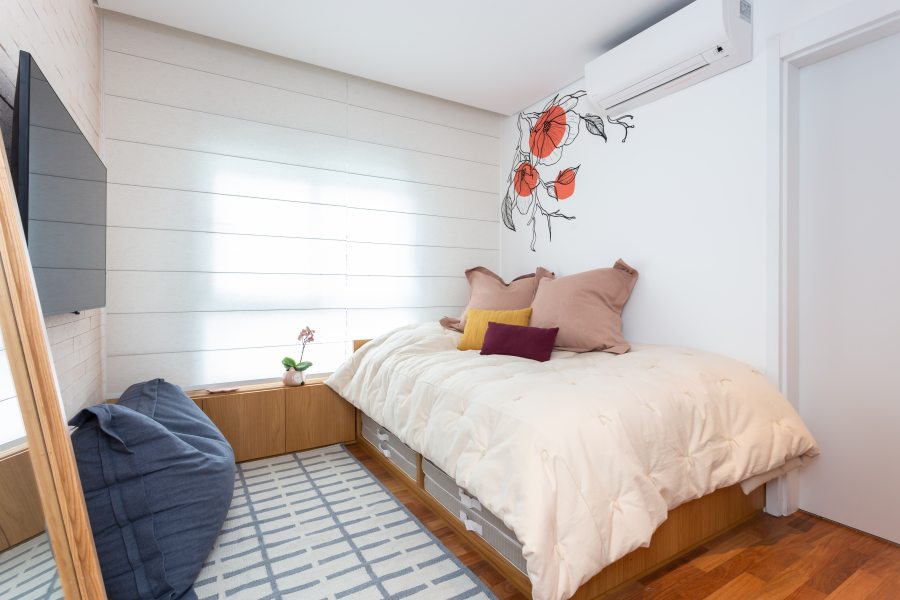 Os diferentes tamanhos contribuem para a atmosfera alegre deste quarto. As almofadas grandes, na cor nude, servem como base para as menores, retangulares, em tom mostarda e marsala. O grande pufe azul desempenha o papel de ponto de descanso e leitura. | Foto: Estúdio São Paulo