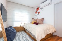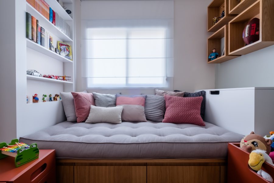 No quarto infantil as arquitetas criaram um cantinho super gostoso para leituras e brincadeiras. As almofadas em cima do futon seguem uma paleta com escalas de cinza e rosa, já empregadas em outros pontos do dormitório, explorando texturas, como veludo, crochê e listras. | Foto: Nathalie Artaxo