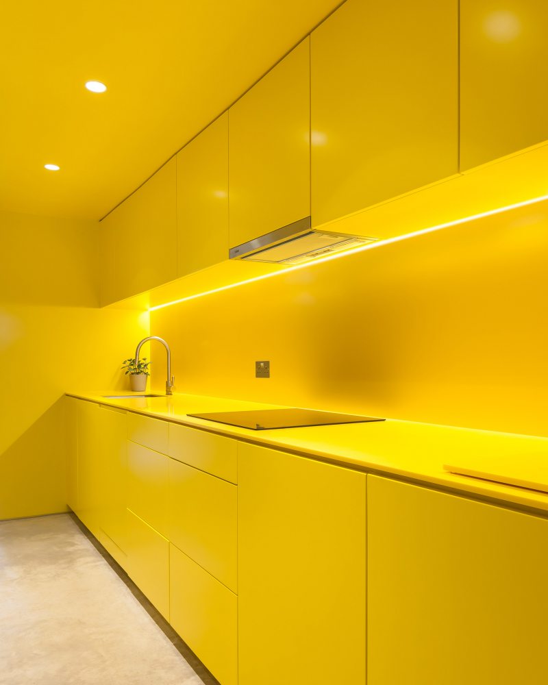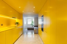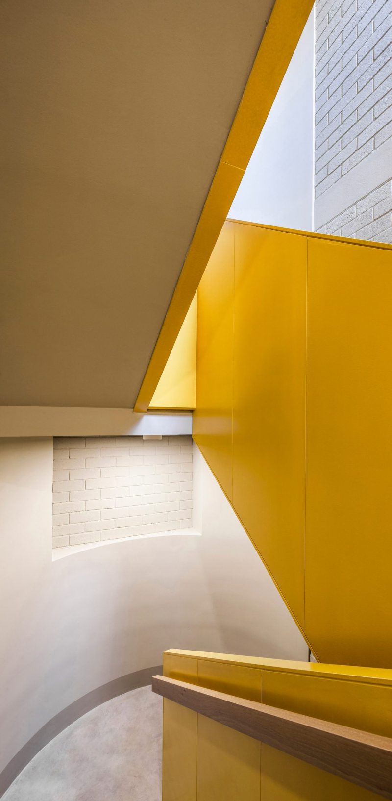Para resolver estas questões os arquitetos refizeram o espaço e o enveloparam, quase completamente, em painéis sob medida e móveis de laca amarela. A escadaria de acesso também foi revestida no material e combinada a luzes embutidas e pisos de cimento polido.