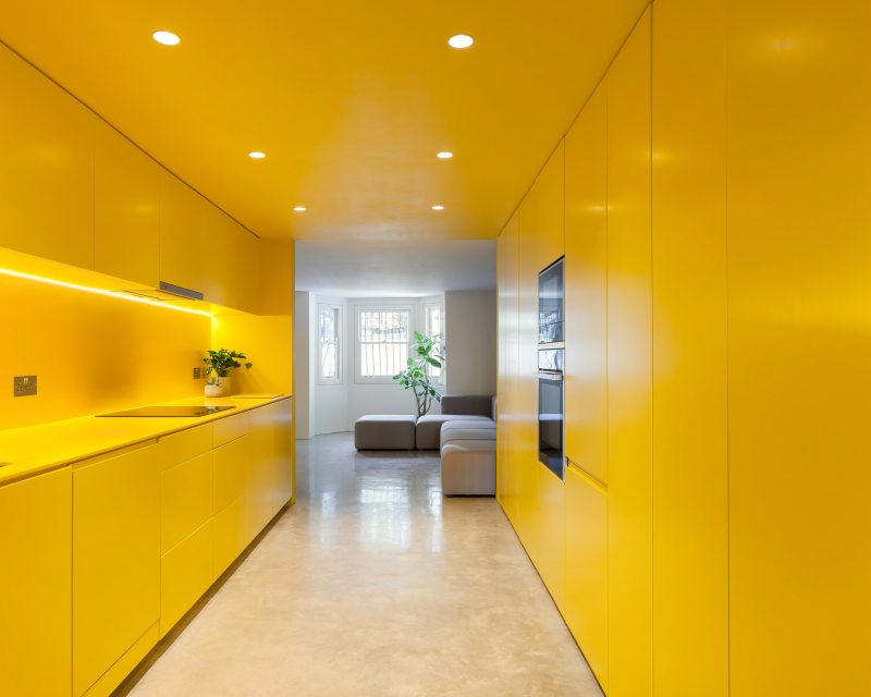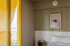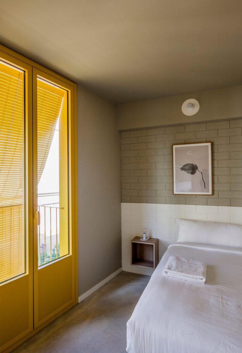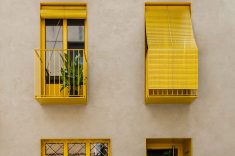 O tom de amarelo vibrante escolhido para a decoração foi utilizado nas sacadas, toldos e molduras amarelas, contrastando com a fachada em estuque rústico e ladrilhos tradicionais. Cada um dos três andares abriga um apartamento distinto, cada um com 40m² e layout flexível para se adaptar a vários estilos e perfis de moradores.
