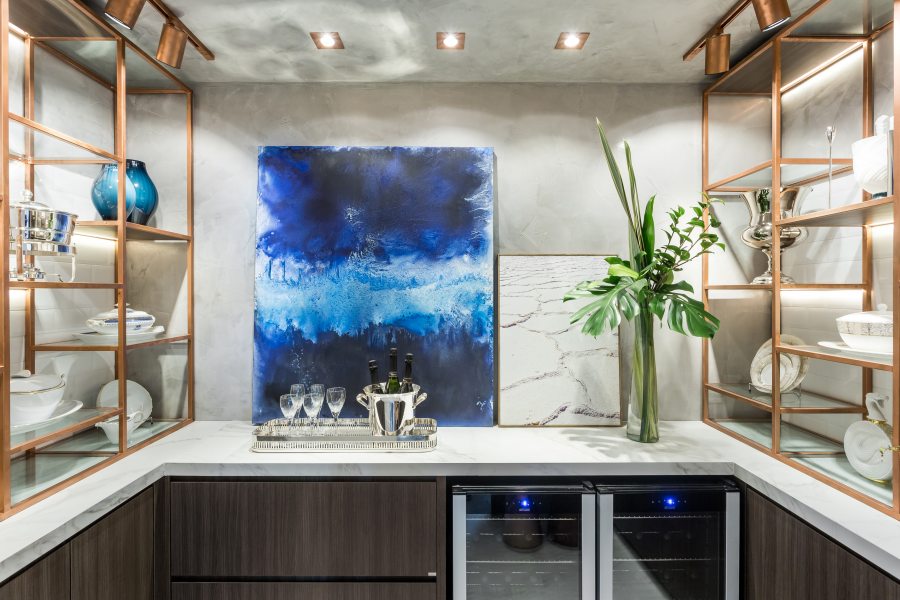 Galeria Varanda de Carla Grüdtner Bar e bistrô de Eduardo Mourão Garagem de Christian e Ricardo Schönhofen Louçaria de Taciana Nakalski O mdf da Arauco reveste porta e parte das paredes no toilette de Mônica Pajewski e Camila Rocha. O produto é indicado para áreas molhadas.