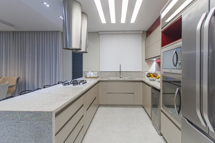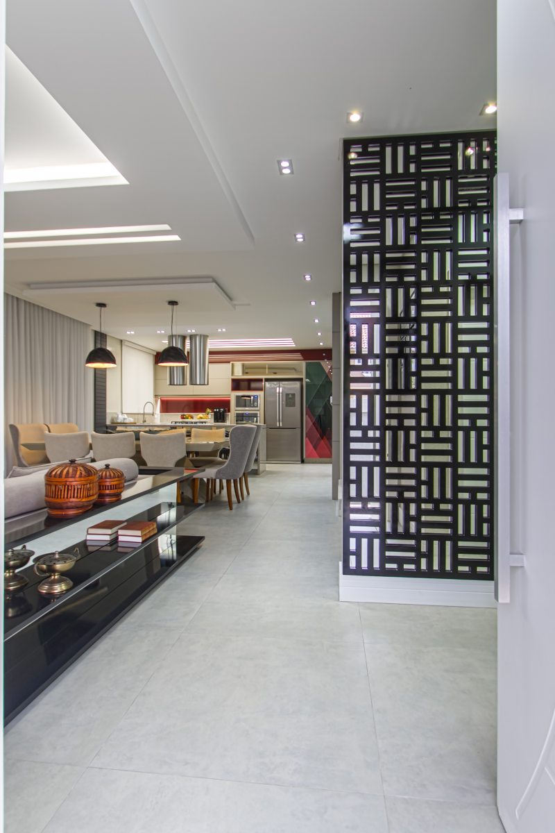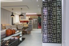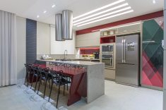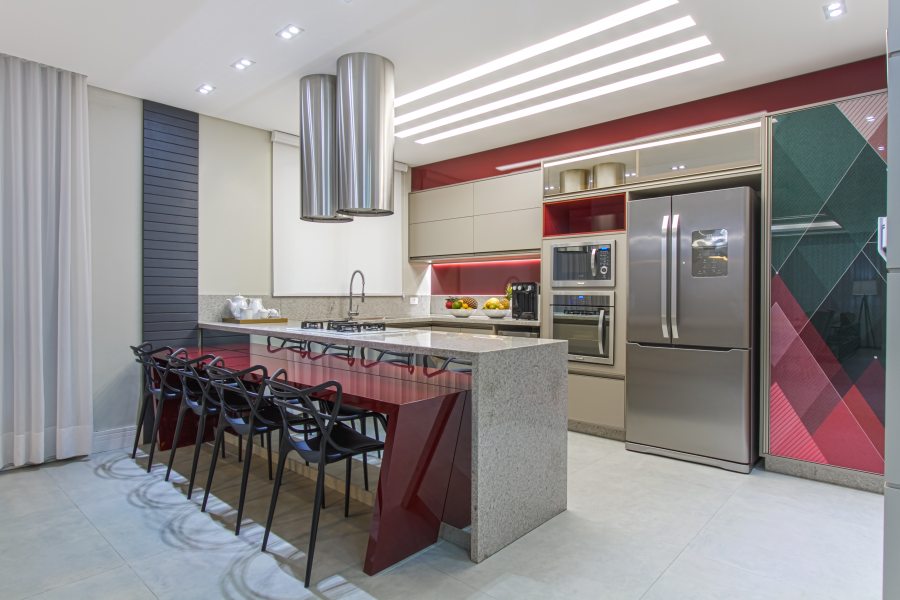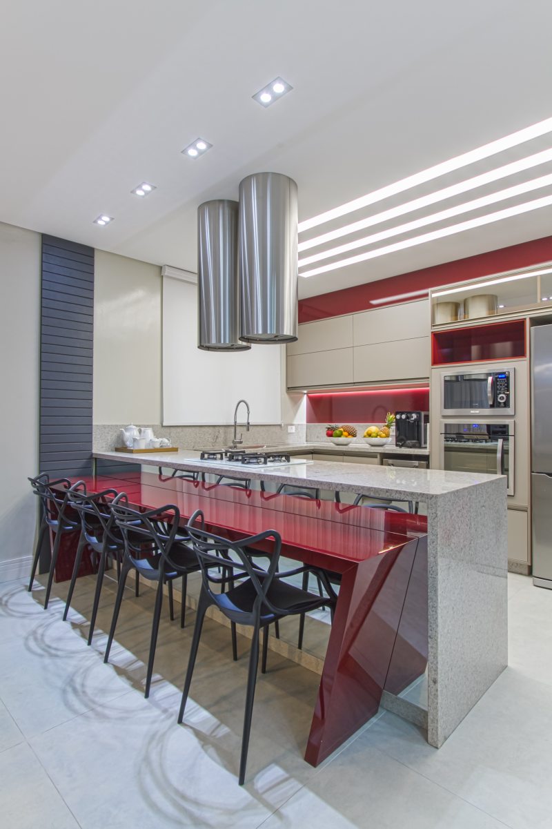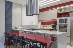 “A família queria um espaço único e elegante, mas não tão sóbrio”, explica Roseli. Para sair do convencional, as profissionais se inspiraram na estética dos programas de TV culinários da televisão americana. O vermelho foi inserido como cor de destaque, aparecendo na mesa que ladeia a bancada e em detalhes na parede do móvel da cozinha. Em uma das portas do armário, adesivo 3D com motivos geométricos, que deixa tudo mais original.