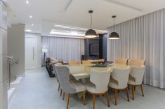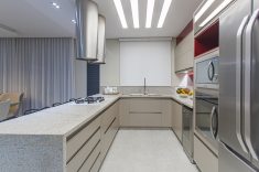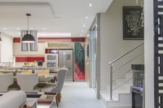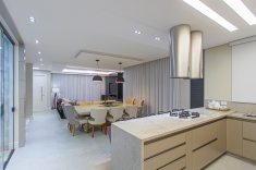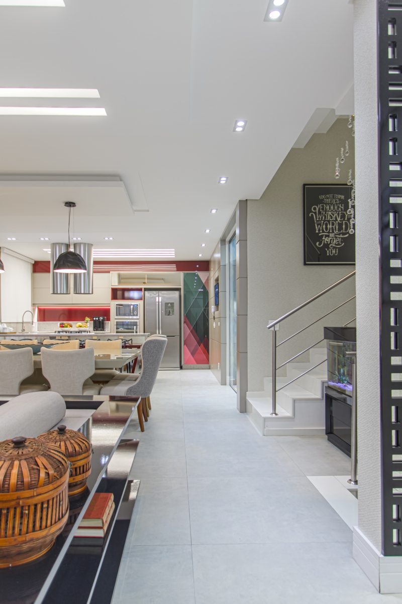 Na cozinha do triplex da família não há espaço para a monotonia. O projeto assinado pelas profissionais Roseli Aderno, Gabriela Meister e Aline Zinher, do Studio Oldine, utiliza cores vibrantes, espelhos e iluminação multifuncional para compor o espaço, que é integrado à sala de jantar e living.