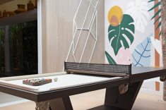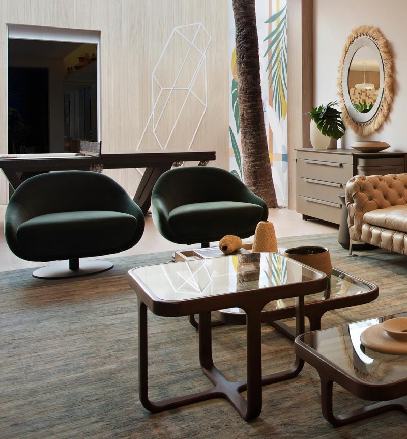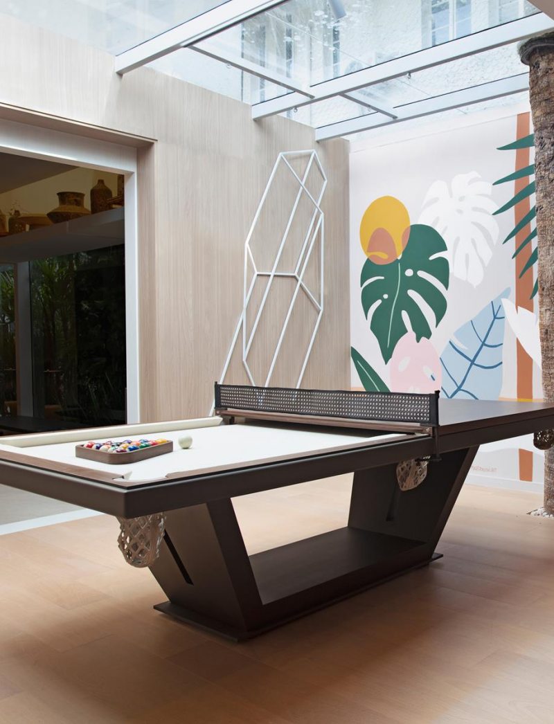 Destaque do projeto, a sala de jogos ganha protagonismo com a iluminação natural do teto de vidro com vista privilegiada para uma enorme palmeira. Além de evidenciar a suntuosidade da mesa de bilhar La La Land - que também pode se transformar em jantar - a entrada de luz enaltece os painéis coloridos com pinturas de art jungle criados pela artista plástica Mari Terleski.