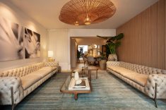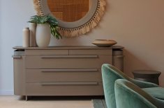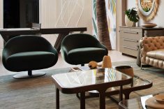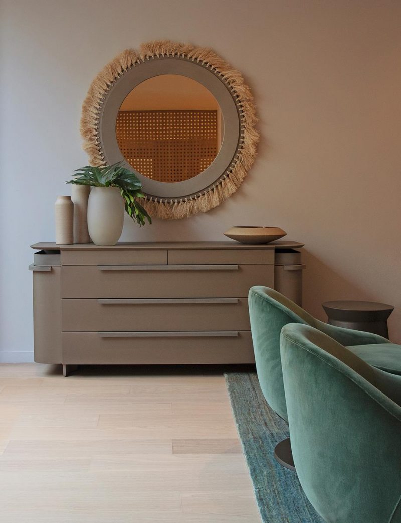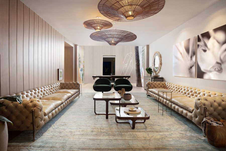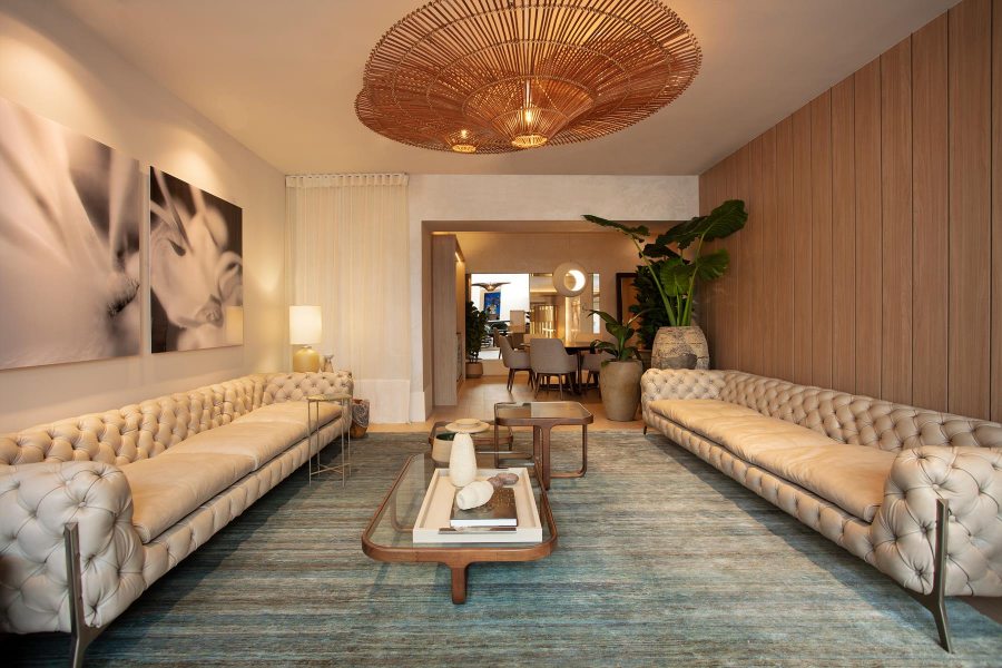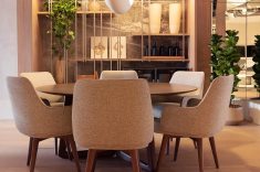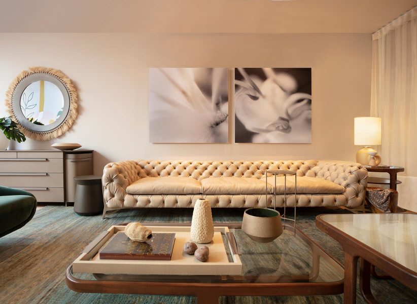 Sob o tema “Natureza Modernista” o ambiente idealizado pelo arquiteto transforma a casa em um refúgio com conceito clean e contemporâneo, porém acolhedor e conectado ao meio natural. O layout, integrado orgânico, é valorizado emoldurado por uma paleta neutra com pontos de cor. No living, tons de verde remetem à conexão com a natureza e permeiam os diversos elementos do décor, como as poltronas de veludo da Artefacto. Os sofás de capitonê, combinados ao tapete de fibras naturais da Botteh, adicionaram sofisticação e conforto ao ambiente.