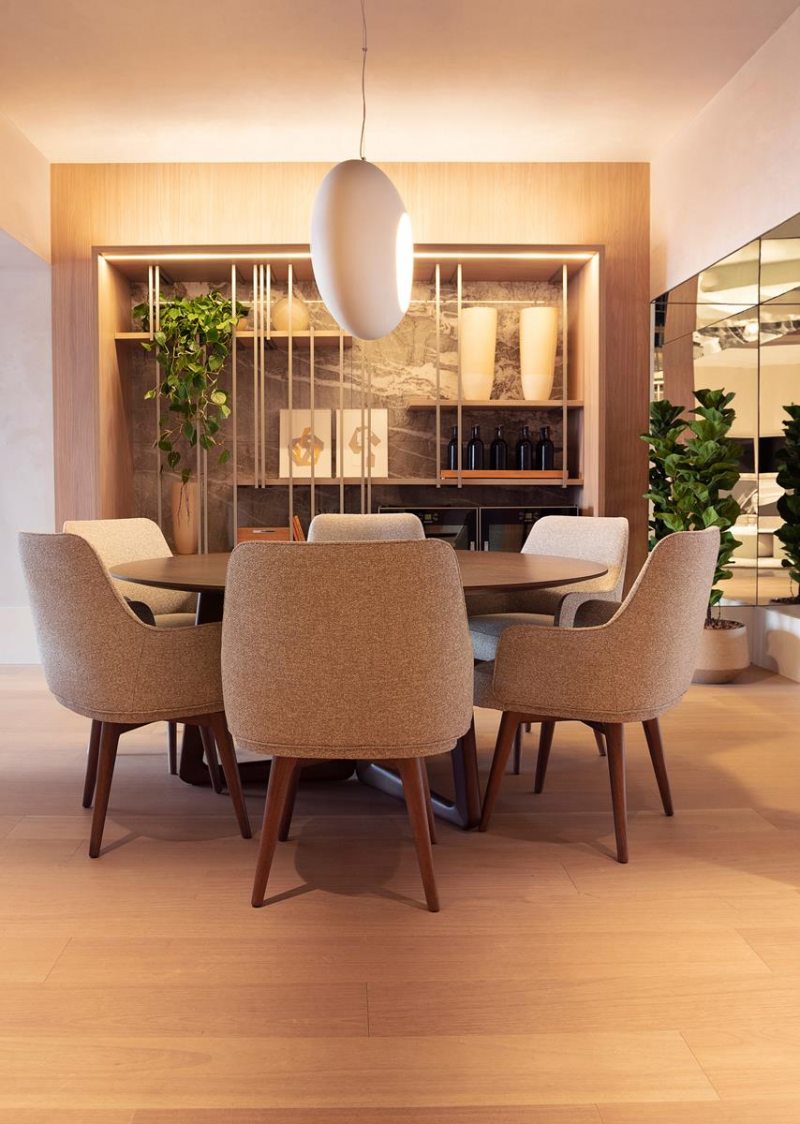 O mix de texturas, presente não apenas nos itens de decoração mas também nas paredes, é outro ponto relevante. As paredes e o teto da sala de jantar foram trabalhadas em textura velvet de tom claro e com brilho suave. As superfícies, revestidas com painéis em MDF Nogueira Thar, foram concebidas para abraçar o ambiente e conectar o décor.