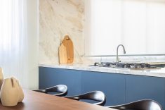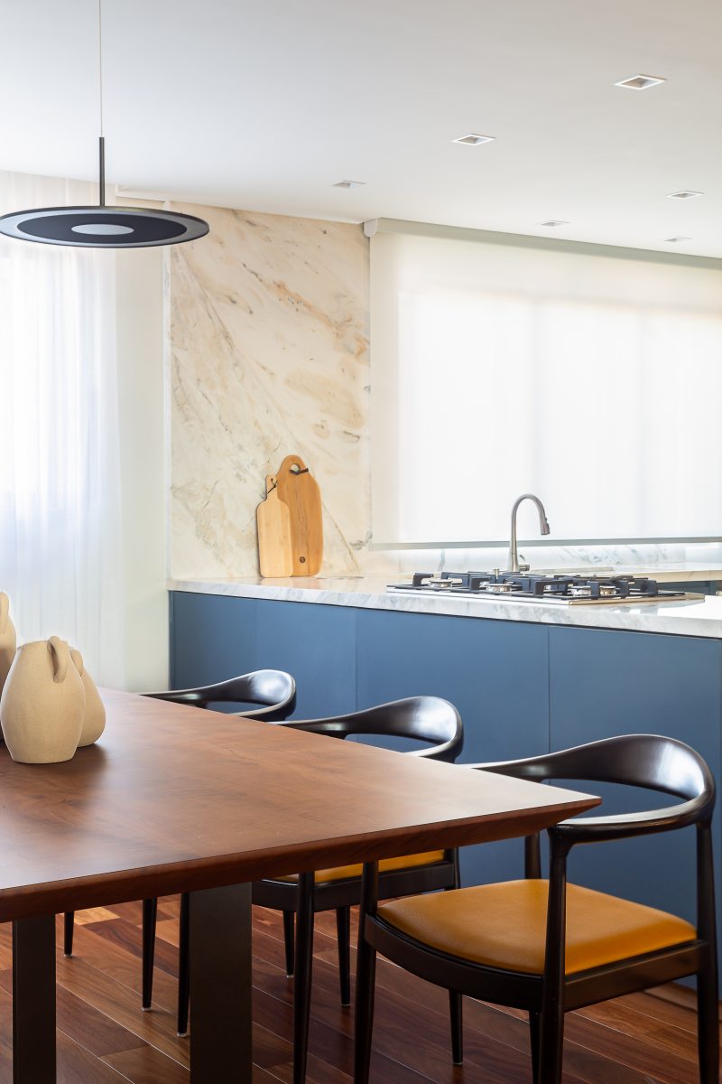Além da cozinha principal a arquiteta idealizou uma cozinha gourmet integrada à sala de refeições. Decorado com mobiliário sob medida azul escuro e bancadas de pedra natural, o espaço gourmet completou a atmosfera festiva da nova área social integrada, que inclui sala de estar, varanda, e um agradável cantinho de leitura em frente à lareira.