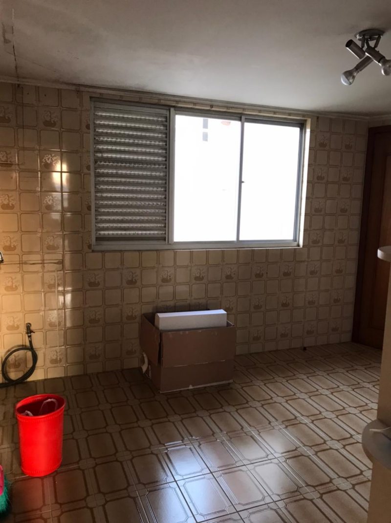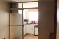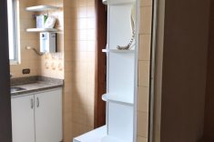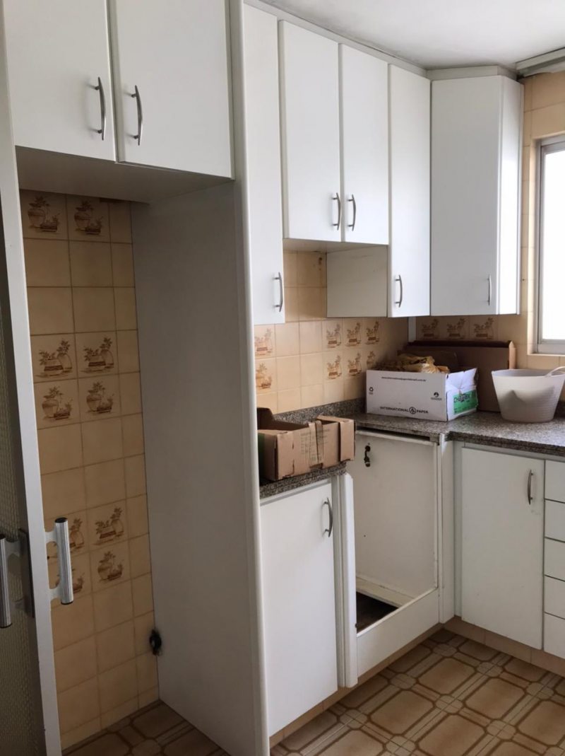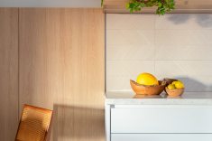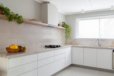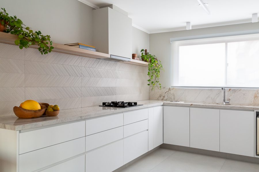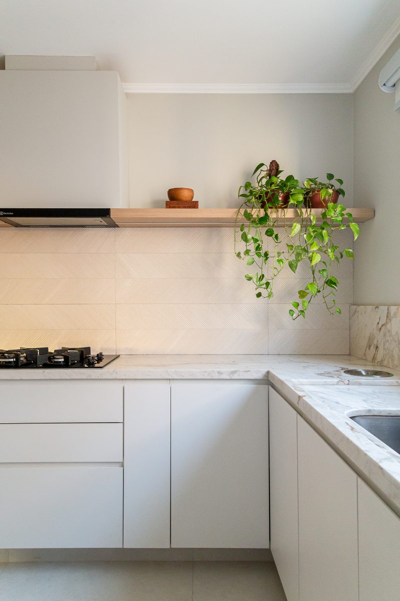 Os azulejos originais da década de 70, que antes ocupavam toda a cozinha, foram trocados por revestimentos de porcelanato com motivos geométricos e uma paleta de cores clara complementada por mobiliário sob medida e eletrodomésticos contemporâneos.