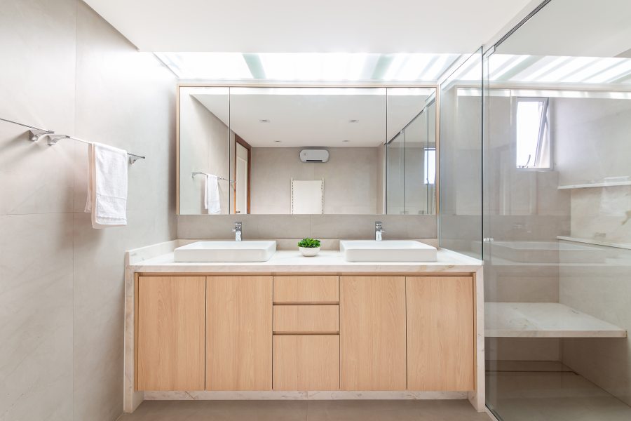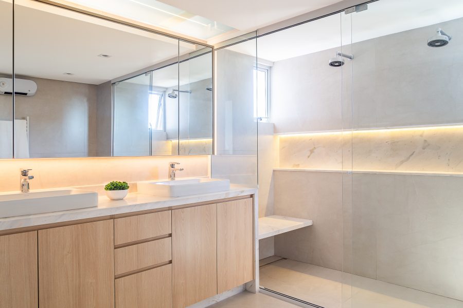 No pavimento superior o banheiro do casal é um dos pontos altos do projeto. O ambiente anterior, escuro e antiquado, deu lugar a um espaço de bem-estar completo: a janela zenital garantiu a iluminação natural abundante, ao passo que o box fechado com duas duchas e banco para sauna completou a atmosfera ideal para relaxar. A iluminação suave, proporcionada pelas fitas de led embutidas nos nichos e no mobiliário, ressaltaram a leveza dos revestimentos claros e das cubas de design minimalista.