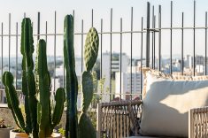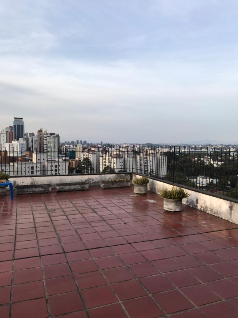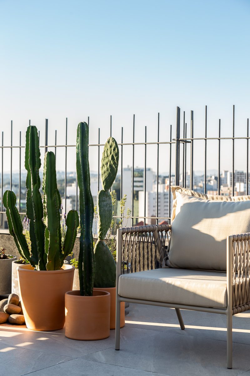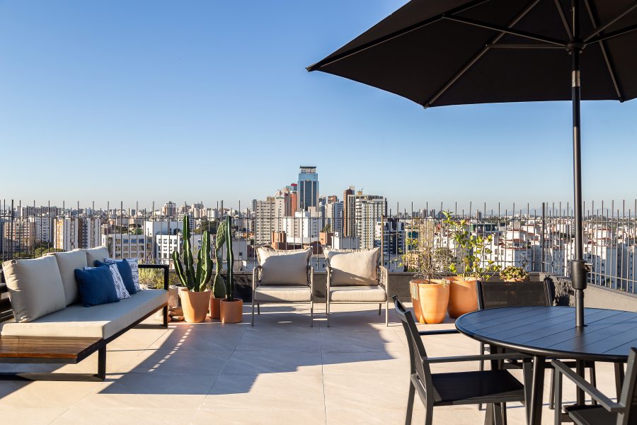O terraço, por fim, revela uma vista de 180 graus para a paisagem urbana, bem no Centro de Curitiba. A mesa de apoio com ombrelone e o mobiliário à prova dos elementos naturais compõem o espaço de convivência convidativo que finaliza este projeto inspirador com chave de ouro.