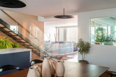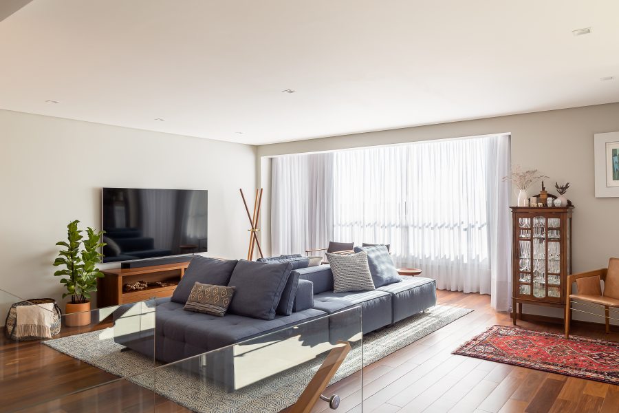 O primeiro passo foi adaptar o apartamento, no estado entregue pela construtora no final da década de 70, às normativas e necessidades atuais dos moradores. A escada em caracol, por exemplo, foi substituída por outra mais ergonômica e moderna, com degraus de madeira e guarda-corpos de vidro transparente que ajudaram a elevar o décor da nova área social.