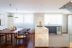 O dramático antes e depois do apartamento, com 400m² de área total distribuídos em três pavimentos distintos, demonstra a complexidade da renovação idealizada e conduzida pela arquiteta Daniela Morales. Original dos anos 70, o edifício era o lar de um casal de moradores com filhos já adultos, que aproveitou a oportunidade de comprar a cobertura para tirar partido da vista e criar um apartamento com a "sensação de casa".