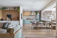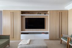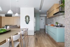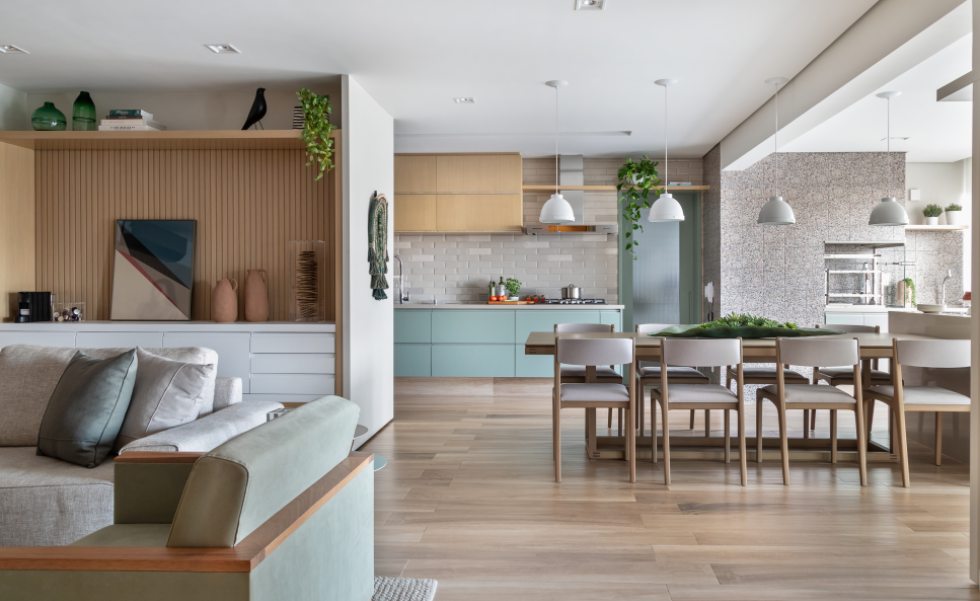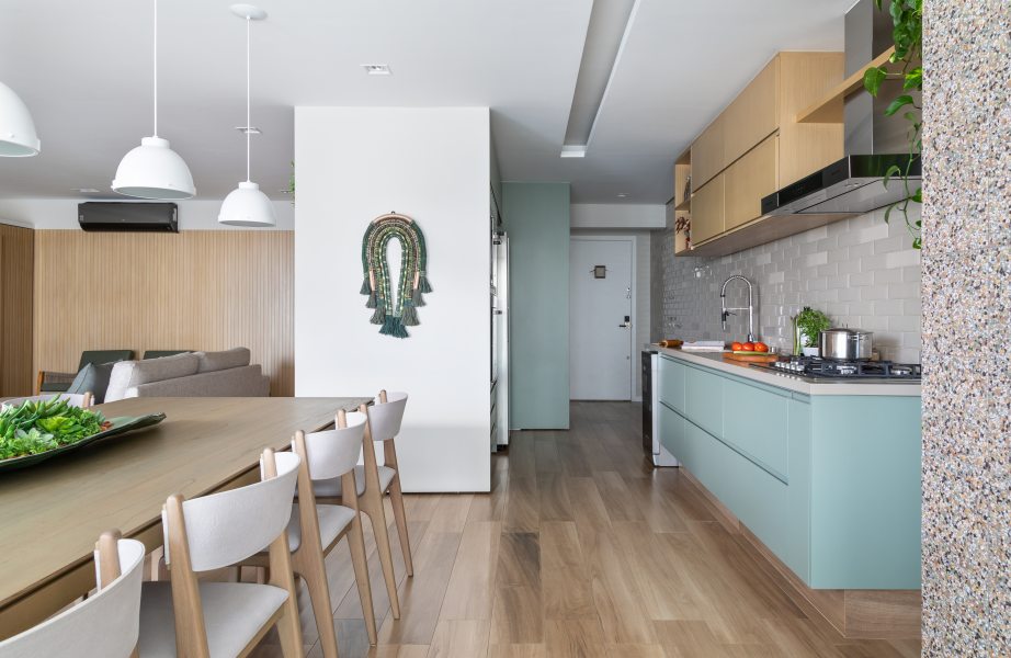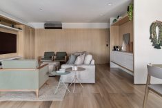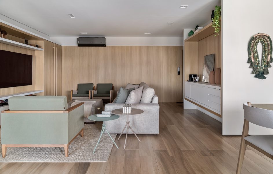 Ao entrar no apartamento, moradores e visitantes são recebidos pela madeira ripada que abraça boa parte da sala. Além da textura contemporânea, sua presença camufla a existência dos armários que recebem louças e outros itens que atendem as salas e a cozinha. A integração área social não foi prejudicada pela setorização visual dos diversos espaços: de um lado, o espaço de TV é definido pela composição de sofás, poltronas e tapetes e, logo atrás, o cantinho do café com um prático móvel desenhado pela arquiteta separa a sala da cozinha.