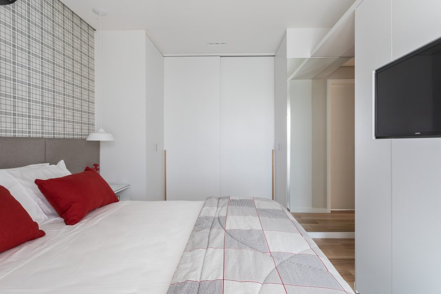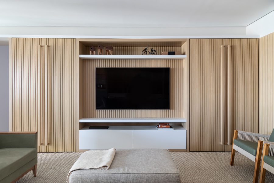 Na ala íntima, a porta de acesso ao quarto do casal fica escondida pelo grande painel de madeira ripada da sala de estar. O layout do dormitório dispôs a cama de um lado e, na frente dela, o armário que embute a TV e esconde a sapateira. Na outra ponta, o closet, em formato de U, é acessado por um sistema de abertura de portas que não ocupa espaço.