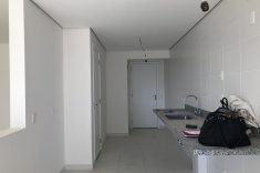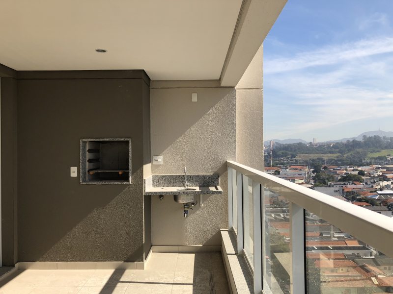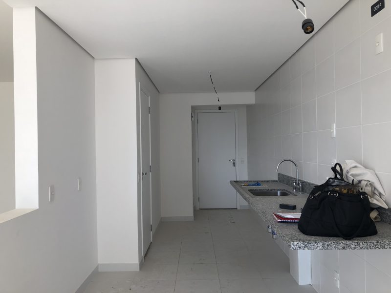Sem as paredes, a varanda e a sala de jantar parecem um único cômodo. Como a churrasqueira entregue pela construtora era formada apenas por uma abertura para colocar carvão, Marina especificou uma bancada de quartzo branco com pia e um fogão elétrico para grelhar carnes. Outra modificação foi a coifa, trocada por um equipamento mais eficiente para a fumaça não se espalhar pelo imóvel.