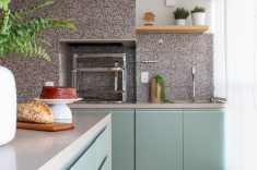 Não foi necessário mudar o posicionamento da bancada na cozinha, porém Marina substituiu a superfície por um material mais resistente, com 4mm de espessura. A parede com revestimento em degradê de cerâmicas em tons de cinza permitiu a inclusão de outros elementos um pouco mais coloridos. Por conta dos armários na parte superior, a inclusão de uma fita de LED auxiliou a iluminar o espaço.