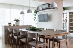 Na conexão com estar, varanda e cozinha, a sala de jantar tornou-se um local bem espaçoso. Por conta da eliminação das paredes da área social, este cômodo ganhou uma mesa extensa, justamente para comportar familiares e amigos que os moradores recebem com frequência. Em uma das extremidades dos móveis, uma ilha, que também serve como aparador, consegue apoiar os utensílios que não cabem na mesa e, para fechar, o ambiente é agraciado pela abundante luz natural e pendentes para os momentos noturnos.