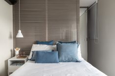 O quarto do filho também demandou modificações. Para ter mais conforto, uma cama de viúvo, muito espaçosa, foi adicionada ao dormitório. A cabeceira, formada por um painel ripado, esconde o pequeno closet que antes funcionava como banheiro. "Criamos uma solução justamente para separar o quarto do pequeno closet. Usamos MDF fendi com ripas vazadas, de 2 cm de altura e 1 cm de espaçamento, garantindo a privacidade do closet", explicou a arquiteta.
