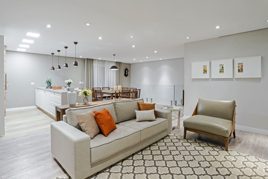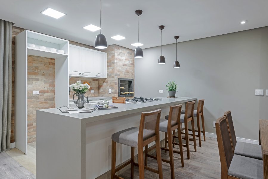 As tonalidades de cor trafegam entre o branco, o bege acinzentado nas paredes e cortinas e a cor terra do revestimento da cozinha e sala. “A parede de tijolo rústico faz uma mistura bem equilibrada com a linha de armários estilo provençal na cozinha e cria um contraste interessante também na sala de estar, além de ficar bem acolhedor”, finaliza Ester.