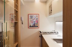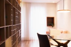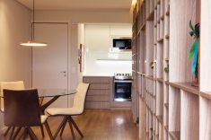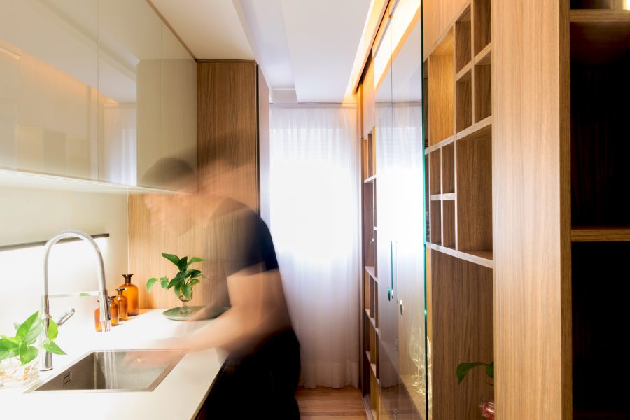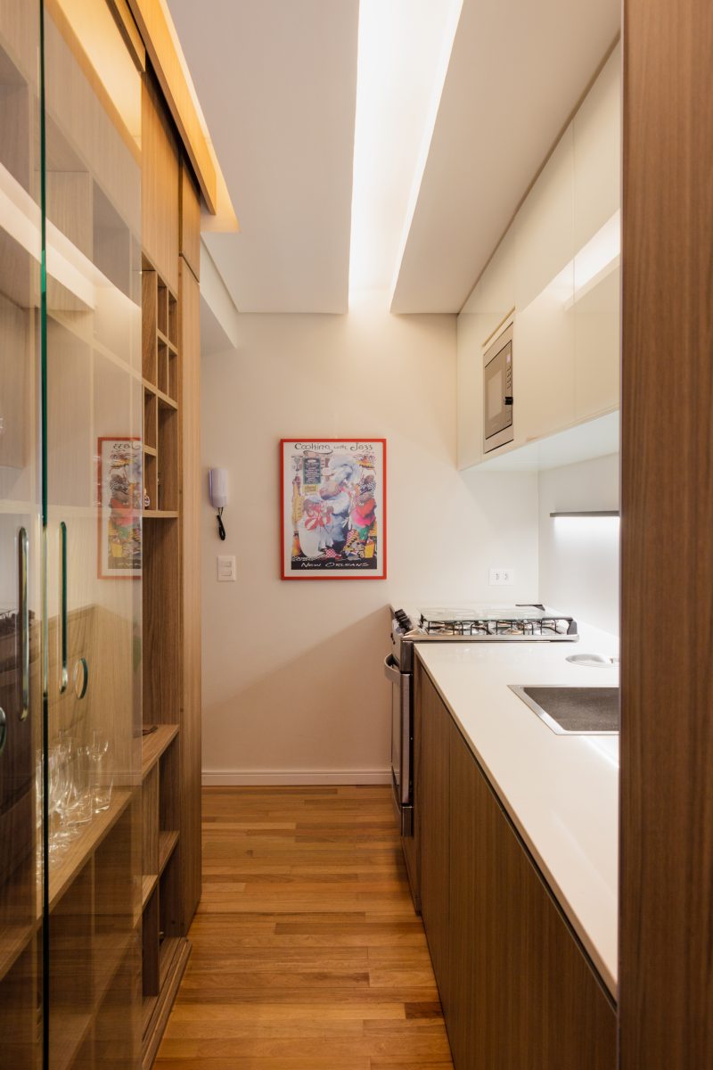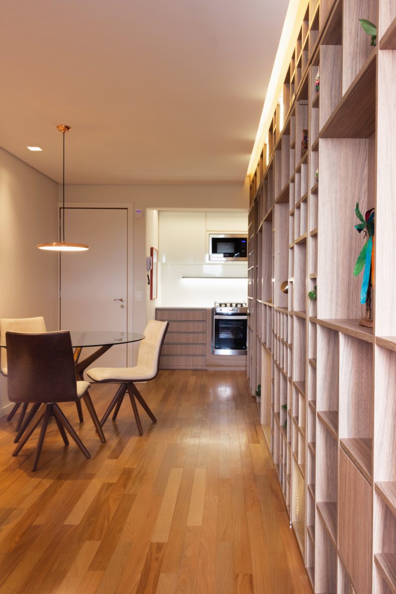 Para a reforma do pequeno apartamento, localizado em um bairro próximo do centro de Curitiba, Brasil, o arquiteto Yuri Vasconcellos da YVA Arquitetura decidiu demolir todas as paredes internas, exceto as do banheiro, para a instalação de uma estante que abrange todo o imóvel. Este móvel multifuncional serve como apoio para louças e utensílios na cozinha, elementos decorativos e livros na sala e, ainda, para delimitar as passagens para acesso aos quartos e banheiro. Ultrapassando a função tradicional de suporte de armazenamento e exibição, a estante atua como um aparato de articulação espacial dentro do reduzido espaço. Além de sinalizar a circulação ao longo da cozinha, sala e sacada, três passagens se camuflam no mobiliário e acessam os demais ambientes.