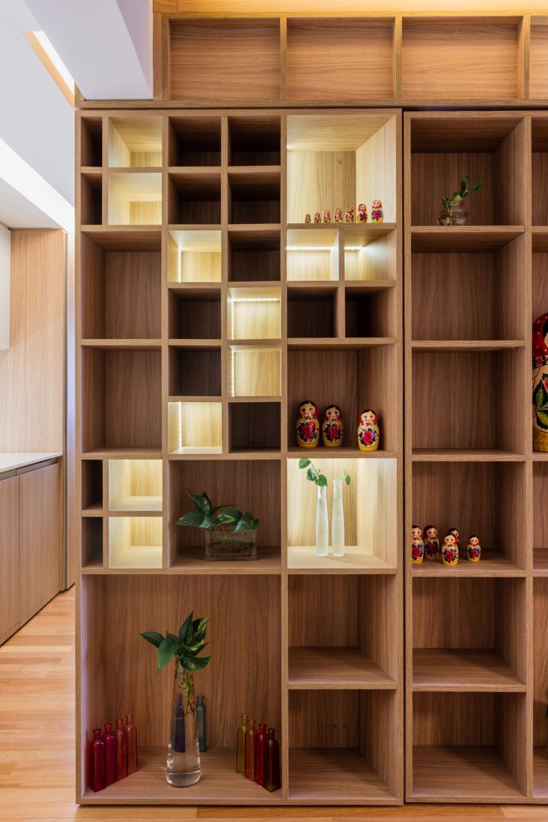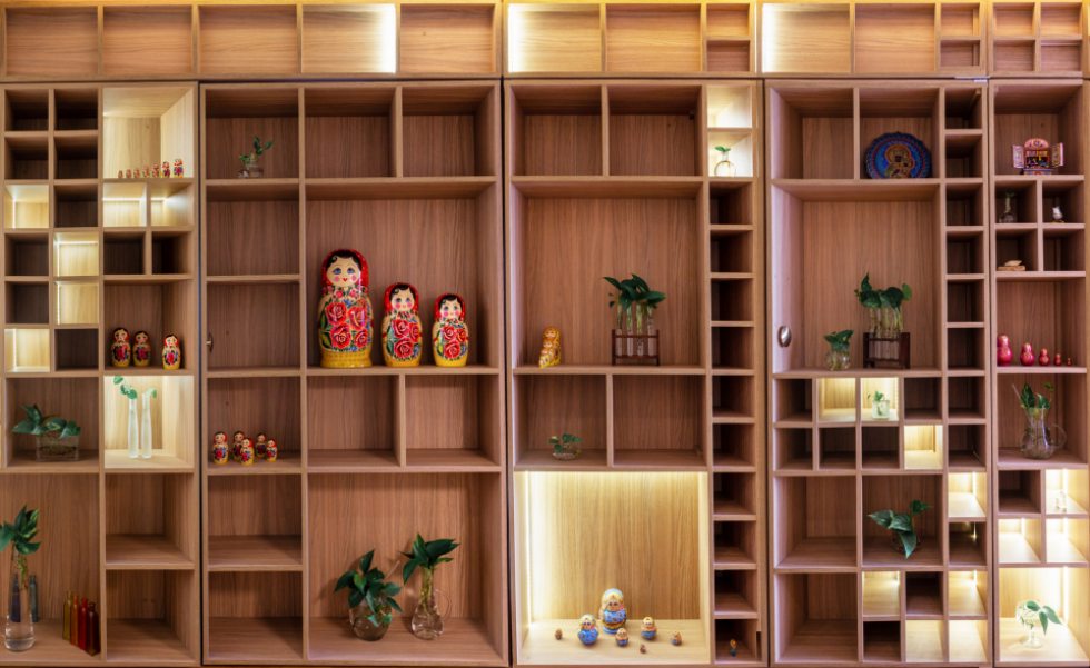 A cliente possui muitos objetos para expor: boa parte deles são pequenos itens colecionáveis, amealhados durante viagens ou ganhos de presente. Entre eles, as bonecas Matrioskas - de origem Ucraniana - somam mais de 20 conjuntos. Para acolher as diversas bonecas a solução foi modular o móvel também em diversos tamanhos. A caracterização dos módulos em tamanhos decrescentes, sempre seguindo a mesma proporção, evoca mesmo mecanismo presente nas Matrioskas, que guardam bonecas idênticas no interior em tamanho cada vez menor. Da mesma forma, a abertura de trechos da estante para revelar o banheiro ou quarto mantém um caráter inesperado ou de surpresa, tal qual a abertura sequencial das bonecas ucranianas.