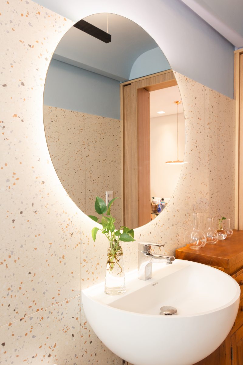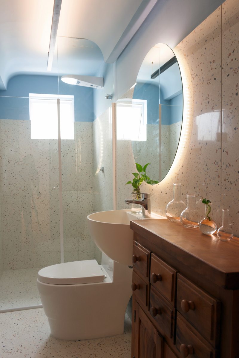 Os acessos aos ambientes privativos foram viabilizados através de pivôs em aço. Enquanto os quartos revelam ambientes neutros - com uma parede em tijolo rústico para aquecer cada ambiente - o banheiro assume uma proposta mais leve. O forro azul se curva próximo das paredes, ao passo que o revestimento de porcelanato com acabamento de granilite suaviza as arestas de curvatura contínua. Estas escolhas provocam um contraste de percepção imediata em relação à estante, com a intenção de potencializar o caráter de surpresa na exploração espacial deste apartamento de 45 m2.