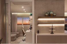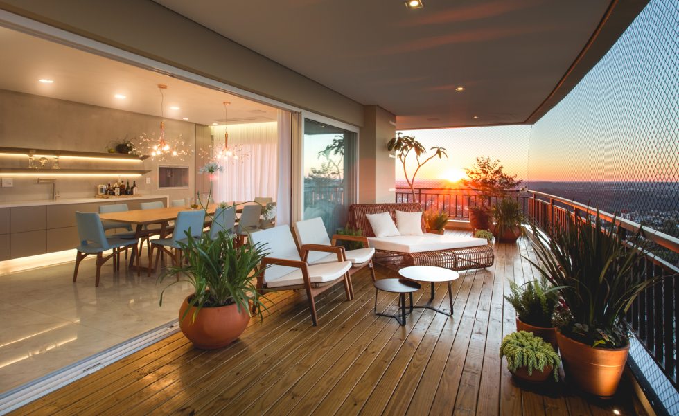 Entregue, ainda inacabado, aos profissionais, o apartamento recebeu algumas mudanças: paredes foram derrubadas ou movidas de lugar para permitir a integração e otimização dos ambientes. Todo o piso da área social e dos banheiros ganhou revestimento em mármore Branco Paraná Argento, enquanto o deck da sacada recebeu madeira natural para despertar uma reconexão com a natureza. A sacada principal ainda ganhou poltronas e chaises confortáveis combinadas a um jardim vertical, proporcionando um ambiente ideal para relaxar e receber amigos.