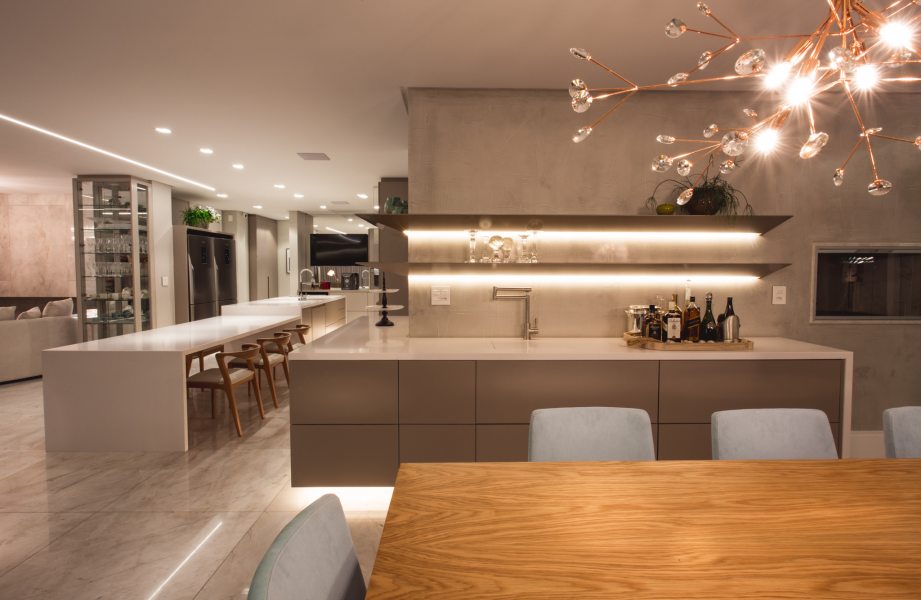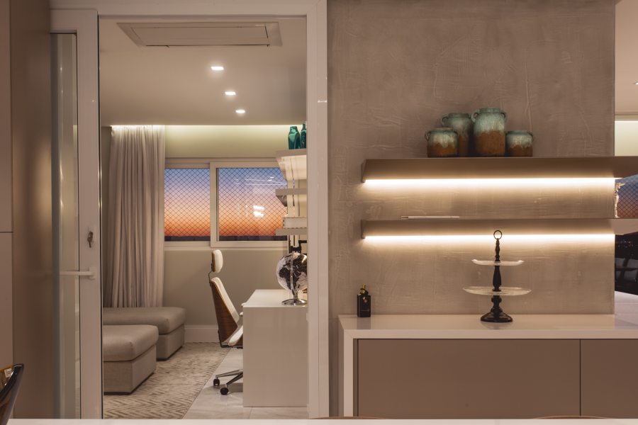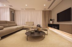 Um apartamento clean, aconchegante e capaz de motivar o convívio em família: este foi o pedido do casal de clientes de meia idade e três filhos adolescentes para o apartamento de 560 m² em Chapecó, Santa Catarina. Empresários do setor têxtil, os moradores precisavam de um descanso das cores e estampas presentes no seu dia-a-dia. Os arquitetos Ary Polis e Renan Mutao, do Studio Architetonika Nomad, optaram pela combinação de cores claras com materiais naturais, promovendo um décor equilibrado.